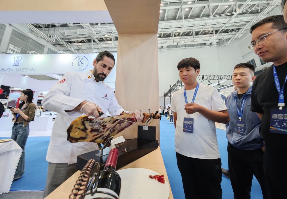 6月16日,在2025年中国·廊坊国际经济贸易洽谈会内外贸一体化进出口商品展区,参观者准备品尝西班牙火腿。新华社发(刘向摄)